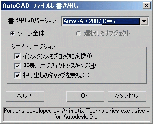 - 3ds Max では、AutoCAD 2010、AutoCAD 2007、AutoCAD 2004、または AutoCAD 2000 への書き出しができます。