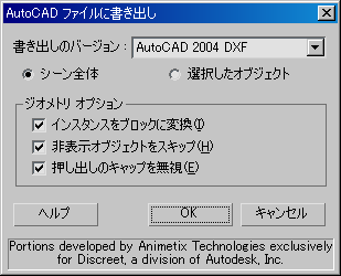 注: DXF 書き出しでは、メッシュ データのみを書き出します。シェイプとスプラインも、すべてメッシュ オブジェクトとして書き出されます。また、シーンにある開いたスプラインはメッシュ オブジェクトに変換できないため、書き出すことができません。