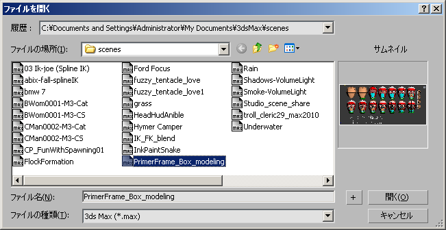 [ファイルを開く](Open File)ダイアログ ボックスには、ファイルを開くための Windows 標準のコントロールが表示されます。その右側の[サムネイル](Thumbnail)領域に、シーンのプレビューが表示されます。ファイル名が、リストの左側でハイライト表示されます。