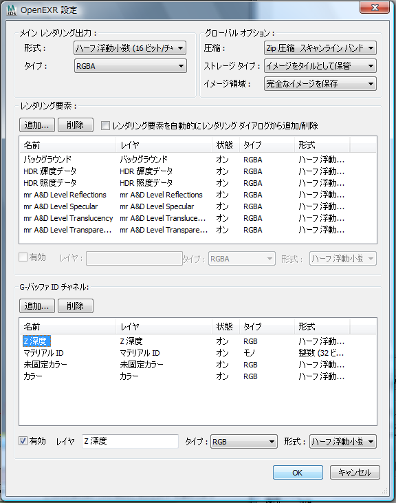 - オンにすると、G-バッファ チャネルが OpenEXR ファイルにレイヤとして保存されます。オフにすると、レイヤとして保存されません。既定値ではチェックマークが付いています。