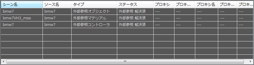 [外部参照登録](XRef Record)リストで現在ハイライト表示されている登録に含まれる外部参照オブジェクト、外部参照コントローラと外部参照マテリアルが表示されます。ハイライト表示されているソース ファイルがない場合、このリストは空です。