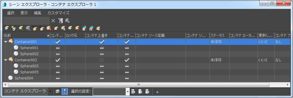 コンテナ エクスプローラは、コンテナとその内容を表示、ソート、選択するモードレス ダイアログ ボックスです。シーン エクスプローラの全機能に加え、コンテナ ツールバーにあるコンテナ専用のコマンドも備えています。