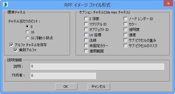 RPF (Rich Pixel Format)は任意のイメージ チャネルを含む能力をサポートする形式です。出力ファイルを設定する時に、リストから RPF イメージ ファイルを選択すると、[RPF イメージ ファイル形式](RPF setup)ダイアログ ボックスに入ります。そこでファイルに書き出すチャネルを指定できます。