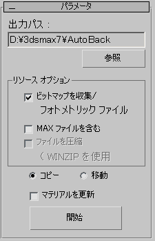 - このチェックボックスにチェック マークが付いている場合、シーン自体(.max ファイル)が出力ディレクトリ内に収集されます。既定値ではチェックマークが付いていません。