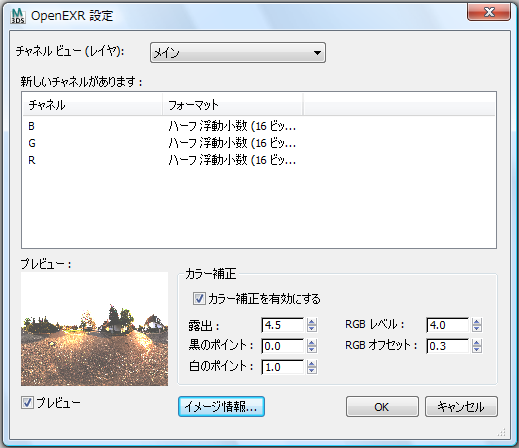 この[OpenEXR 設定](OpenEXR Configuration)ダイアログ ボックスは、EXR ファイルを開いたときに必ず表示されます。使用するレイヤの選択、カラー補正の適用、イメージのプレビューができます。