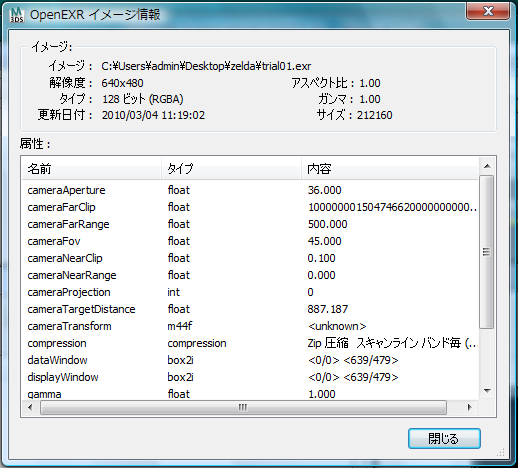 - クリックすると、EXR ファイルに関する情報を示す読み取り専用のダイアログ ボックスが表示されます。情報にはイメージのプロパティの他に、カメラ アトリビュートや解像度などの、ファイルに保存されるメタデータが含まれます。