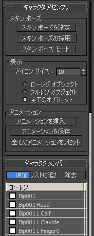 キャラクタ アセンブリのすべてのメンバが、このリストに表示されます。既定値では、すべてのメンバは完全解像度オブジェクトとして指定されています。メンバを低解像度として指定するには、リスト上のオブジェクトにチェックマークを付けます。完全解像度および低解像度は、[キャラクタ アセンブリ](Character Assembly)ロールアウトの[表示](Display)領域とともに使用されます。