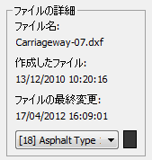 たとえば、 Carriageway1.dxf という DXF ファイルには、ファイル内のサーフェスに適用されたマテリアル チャネルの18 (アスファルト)があります。 Ground1.dxf という DXF ファイル内にあるサーフェスには、27 地盤タイプ 2 が適用されたマテリアル チャネルがあります。