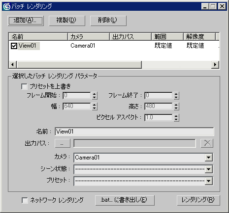 注: [バッチ レンダリング](Batch Render)ダイアログ ボックスでは、たとえば複数のカメラからのビューのような、同じシーン内の複数の異なったアスペクトをレンダリングするときに使用します。異なる大量のシーンをバッチ レンダリングする場合は、Backburner か、コマンドライン レンダリングを使用します。