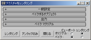 テクスチャのレンダリング(いわゆる「テクスチャのベイク処理」)は、このダイアログ ボックスで制御します。このダイアログ ボックスのほとんどのコントロールは、ロールアウトに含まれています。