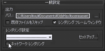 [テクスチャをレンダリング](Render To Texture)ダイアログ ボックスを使用している場合は、[一般設定](General Settings)ロールアウトで[ネットワーク レンダリング](Network Render)をクリックしてオンにしてから、ダイアログ ボックスの下部にある[レンダリング](Render)をクリックします。