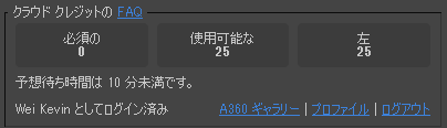- このボタンをクリックして Autodesk Cloud にログインします。ログインすると、このパネルにリソース、予想待ち時間、Autodesk レンダリング インタフェースへのリンクが表示されます。