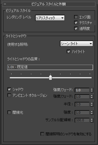これらのコントロールでは、レンダリングのビジュアル スタイルとレンダラーが照明を処理する方法を選択できます。
