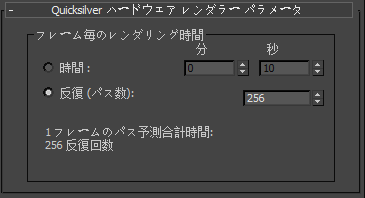 Quicksilver ハードウェア レンダラーのメイン ロールアウトでは、レンダリングに要する時間または実行する反復の数を設定して、レンダリング品質を調整できます。