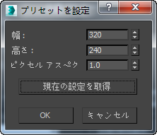このダイアログ ボックスでは、[共通パラメータ](Common Parameters)ロールアウトの[出力サイズ](Output Size)領域に表示されるボタンのプリセット解像度を変更できます。