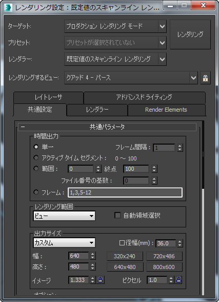 このパネルには、静止イメージまたはアニメーションをレンダリングするかどうか、レンダリング出力の解像度の設定など、レンダラーに対する一般コントロールがあります。