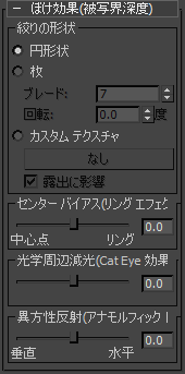 絞りを垂直方向(負の値)または水平方向(正の値)にストレッチすることによりアナモルフィック レンズをシミュレートします。