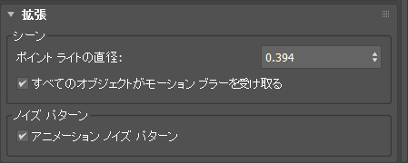 注: ノイズ パターンをアニメートして、フィルム グレインと類似した、より自然な外観を持つ高品質のアニメーション レンダリングを実現します。低品質(ドラフト)レンダラーでは、静的なノイズ パターンを使用すると便利な場合があります。