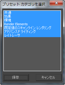 各カテゴリは、[レンダリング設定](Render Setup)ダイアログ ボックスのパネルに対応しています。保存するパネルの設定を選択し、[保存](Save)をクリックします。カスタム プリセット ファイルを保存すると、そのファイルの名前が既定値とともにドロップダウン リストに表示されるようになります。