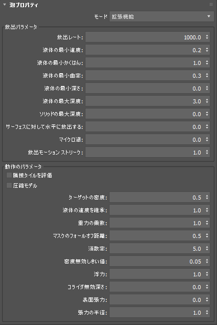 - [圧縮モデル](Compression Model)の方法の計算が泡シミュレーションにどのように適用されるかを制御します。この値を大きくすると、パーティクルが互いに反発する前に、より多くのパーティクルをオーバーラップすることができます。 一般的な泡シミュレーションでは、0 から 2 の間の値を使用します。