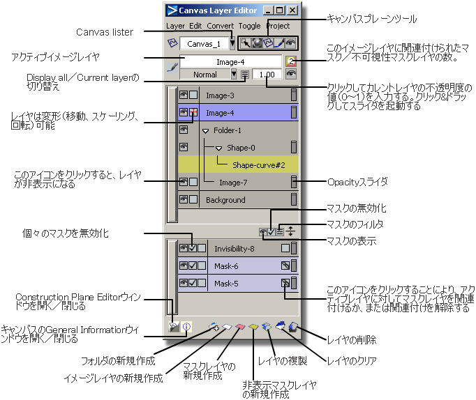 Canvas Layer Editor ウィンドウを開いて、イメージ レイヤ、マスク レイヤおよびシェイプ レイヤの配置を制御できるようにします。
