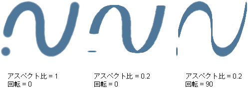 Aspect はブラシ スタンプの平坦および円形の度合いを制御します。アスペクト比を 1 にすると、ブラシのスタンプは円形になります。アスペクト比を小さくするに従い、ブラシのスタンプは平坦になります。平坦なスタンプの角度は、ブラシの Rotation に基づきます。