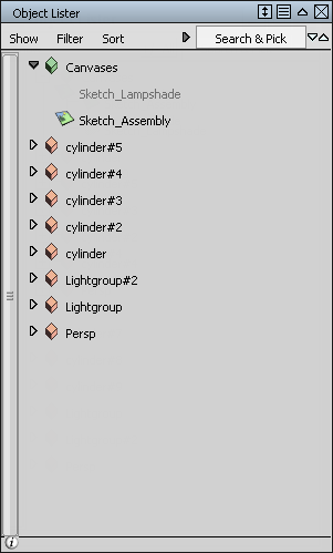 ここでは、グループ化によってモデルを組織化します。1 つのグループはスタンドの基部に、もう 1 つのグループは傾斜したアームと蝶番にします。Object Lister を使用してグループの名前付けと管理を行います。Object Listerは、シーンのオブジェクトの概略ビューです。これはデザインのコンポーネント管理に便利です。