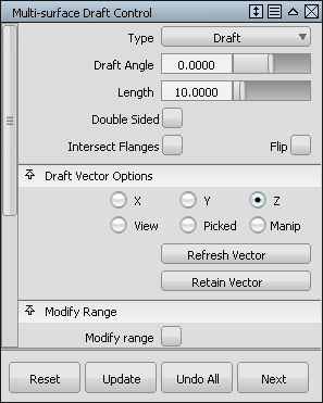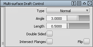 Multi-surface Draft Control ウィンドウで、設定を Draft Angle を -3 度、Length を 2 に変更し、Update をクリックします。