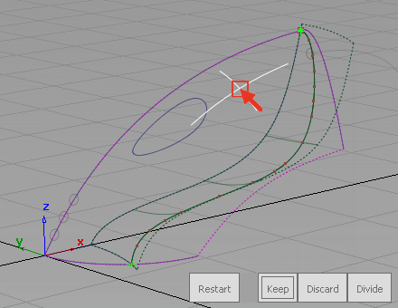 トリム サーフェスは切り取られていません。レンダリングされず、モデリングに影響を与えない非表示の状態で存在しています。トリミングを実行するときに、ジオメトリの不要な部分を選択し、画面の右下コーナーに表示される Divide ボタンをクリックすると、トリム サーフェスの一部を簡単に破棄できます。