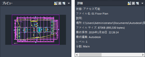 [プレビュー/詳細ペイン]を選択すると、 (プレビュー)をクリックしてプレビューを表示したり、 (詳細)をクリックして選択した図面ファイルの説明を表示したりできます。