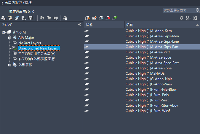 このリンクをクリックすると、[画層プロパティ管理]が表示され、[一時的な新規レイヤ]フィルタが自動的に選択されます。リスト ビューに、図面またはアタッチされている外部参照に追加されたすべての新規レイヤが表示されます。