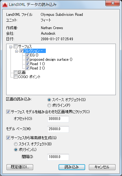 注: LandXML ファイルには、寸法計算のための作図単位の情報が含まれています。LandXML ファイルをそれとは作図単位が異なる図面に読み込むと、LandXML データは現在の DWG の単位に変換されます。メートル単位の LandXML ファイルをミリメートル単位の図面に読み込むと、変換後の座標値が、正確な計算が可能な範囲を超える場合があります。