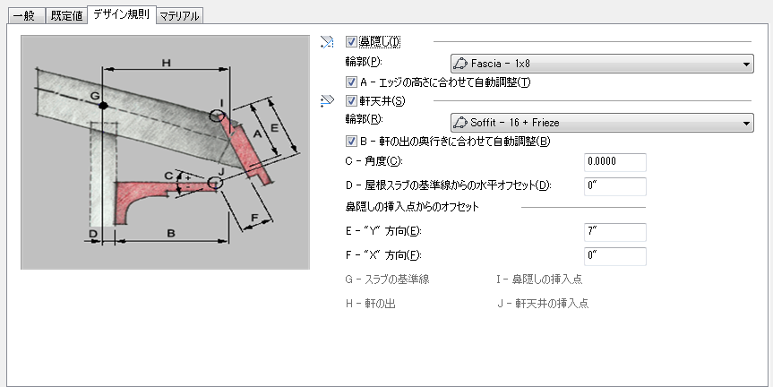 スラブまたは屋根スラブ エッジ スタイルの鼻隠しと軒天井を指定するには、次の手順を実行します。図面に鼻隠しと軒天井の輪郭が含まれていることが必要です。