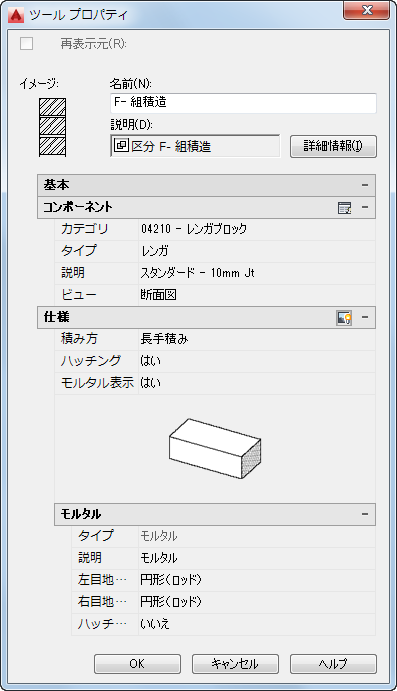 [ツール プロパティ]ワークシートの外観は、コンポーネントのタイプとプロパティ設定の現在の設定に応じて異なります。以下の図は、サンプルの基本ツール パレットに含まれる 04 - 組積造ツールのツール プロパティ ワークシートの 2 つの構成を示しています。いずれの場合でも、このツールは標準の 3/8” 継手レンガを追加するように設定されていますが、1 番目のものは設定で[ビュー]プロパティが[断面]に設定されており、2 番目はこのプロパティが[立面線図(パターン)]に設定されています。ビューによって異なる方向に配置できる詳細コンポーネントについては、[ビュー]設定によって、図面にイメージを挿入する方法が決まります。異なる[ビュー]設定では、ワークスペースで異なる方向を向いた図になることに注意してください。モルタル仕様は[立面線図(パターン)]設定には適用されず、したがってこの構成では表示されないことにも注意してください。[仕様]の下に表示されるプロパティは、設定に応じて異なることがあります。たとえば、[モルタルを表示]プロパティは、[ビュー]設定が[断面]の場合は[いいえ]になり、モルタル プロパティは表示されません。詳細コンポーネントの中には、仕様が適用されず、見出しが表示されないものもあります。