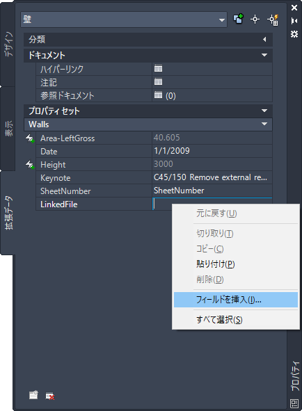 日付/時刻、ドキュメント、ハイパーリンク、オブジェクト、システム変数、Diesel 式、または印刷フィールドを挿入する | AutoCAD ヘルプの「文字内でフィールドを使用する」を参照してください。 |