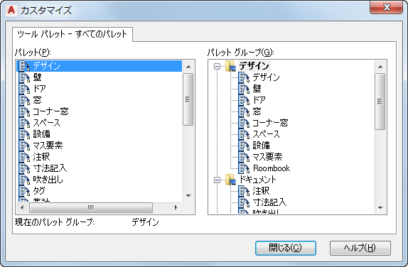 • プロジェクト ツール パレット グループに少なくとも 1 つのパレットが含まれている場合は、使用できるツール パレット グループのリストに表示され、選択することができます。