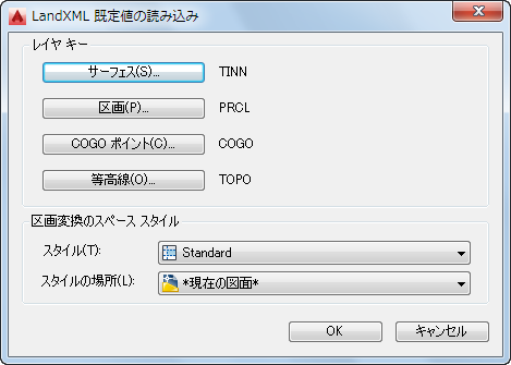 読み込んだ異なるタイプの LandXML データに既定のレイヤ キーを設定するには、次の操作を実行します。COGO ポイント、区画、サーフェス、等高線ラインに対して個別にレイヤ キーを設定できます。