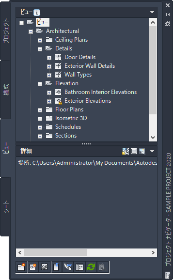 プロジェクト ナビゲータ パレットの[ビュー]タブでは、建物データの個々のビューを作成します。ビューは構成を含み、プロジェクト内の注記、タグ、寸法などの注釈の追加は主にここで行います。ビュー図面を作成したら、図面内にモデル空間ビューを作成できます。