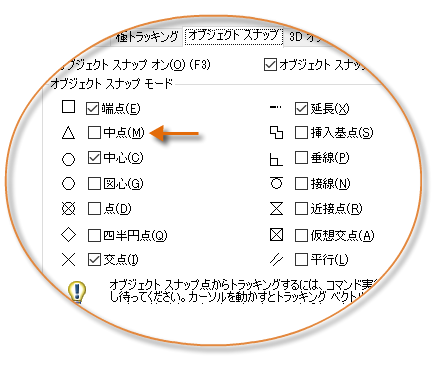 「定常オブジェクト スナップ」と呼ばれる既定のオブジェクト スナップを設定するには、OSNAP[オブジェクト スナップ設定]コマンドを使用します。たとえば、[中点]オブジェクト スナップを既定でオンにしておくと便利な場合があります。