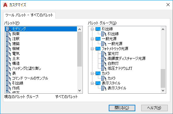 ツール パレット グループとそれぞれに含まれるツール パレットが表示されます。