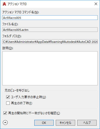 現在のアクション マクロ ファイルが保存される場所が表示されます。
