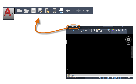 作図領域の上部に標準のタブ リボンが表示されます。[ホーム]タブから、このガイドで紹介するコマンドのほとんどにアクセスできます。また、下に示すクイック アクセス ツールバーには、[新規作成]、[開く]、[保存]、[印刷]、[元に戻す]など、頻繁に使用するコマンドが含まれています。