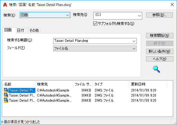 検索する図面、ブロック、画層、外部参照の名前、またはその他のコンテンツの種類を指定します。
