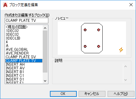 現在の図面に保存されているブロック定義のリストが表示されます。このリストからブロック定義を選択すると、[作成または編集するブロック]フィールドにその名前が表示されます。