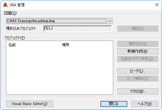 Visual Basic Editor が表示され、開いた図面内の任意のロードされたグローバル VBA プロジェクトや埋め込み VBA プロジェクトのコード、フォーム、参照の編集ができます。Visual Basic Editor からプロジェクトをデバッグしたり実行することができます。