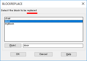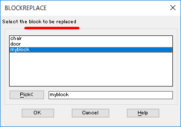 リストからブロックを選択するか、[Pick]ボタンをクリックして図面でブロックを選択することで、検索するブロック名を指定します。