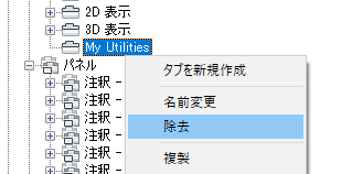 注意: リボン タブからのリボン パネルの除去操作を元に戻す方法はありません。間違ったリボン パネルを除去してしまった場合は、[キャンセル]をクリックして[ユーザ インタフェースをカスタマイズ] (CUI)エディタを閉じることによって、変更が保存されないようにしてください。ただし、このようにすると、意図したものも含めすべての変更が元に戻されてしまいます。