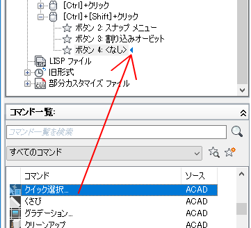 4. マウス ボタンに追加するコマンドを、[コマンド一覧]ペインから[<ファイル名> 内のカスタマイズ]ペインまでドラッグします。