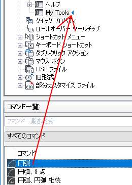 コマンドを、[コマンド一覧]ペインから[ <ファイル名> 内のカスタマイズ]ペインのプルダウン メニューまたはプルダウン メニューより下位の場所にドラッグします。
