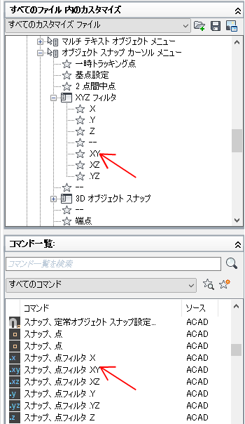 - [カスタマイズ]タブの[コマンド一覧]ペインで、[ <ファイル名> 内のカスタマイズ]ペインのユーザ インタフェース要素に追加するコマンドを検索してドラッグします。